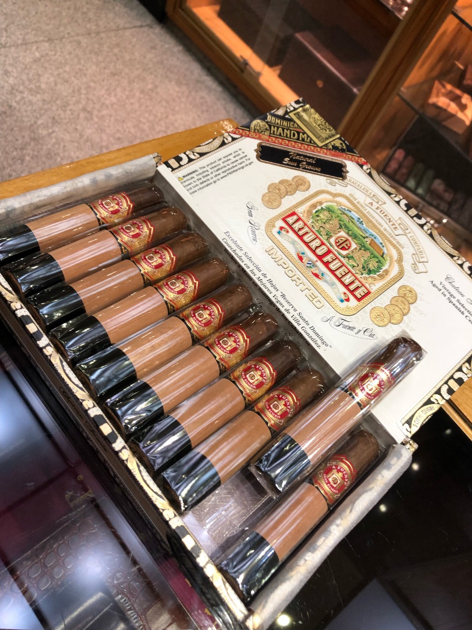 De la casa Arturo Fuente, ya se ha escrito bastante últimamente, no voy a descubrir nada nuevo si les digo que es una fábrica fundada a principio del siglo pasado en Florida, USA. Que luego de un feroz incendio suspendió sus actividades hasta finales de los años 40 y con posterioridad al embargo en Cuba, esta marca inició un camino de crecimiento basado en la calidad convirtiéndola en una de las marcas premium más prestigiosas fuera de Cuba. Y desde su base en República Dominicana elabora puros de altísima calidad. Hoy me llega a mis manos, cortesía de Bellagio Habanos Lounge, un Chateau Fuente Sun Grown. Esta es una línea compuesta por tres opciones de diferente capa: natural, maduro y sun grown, que en este momento estoy fumando.