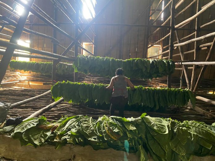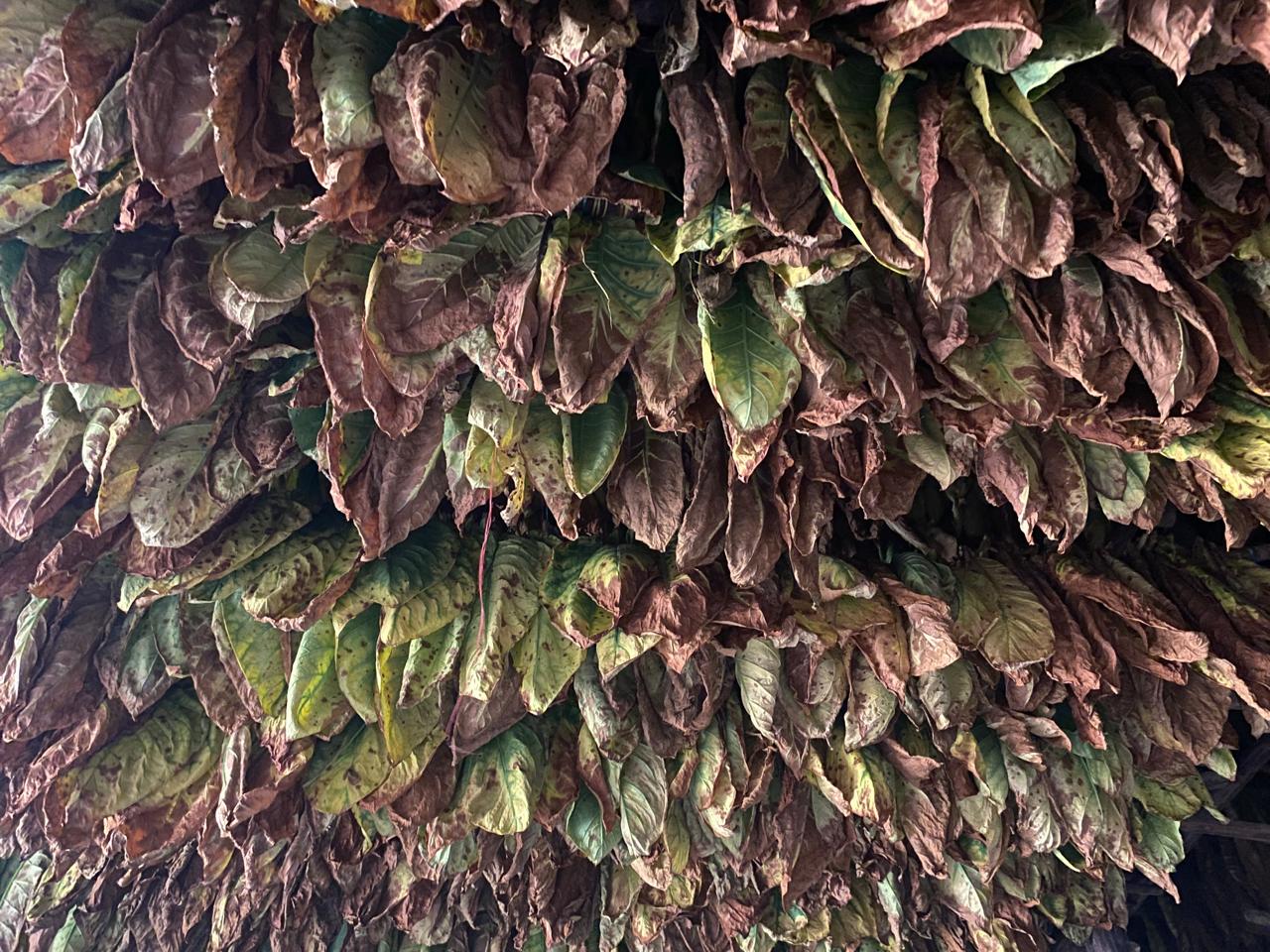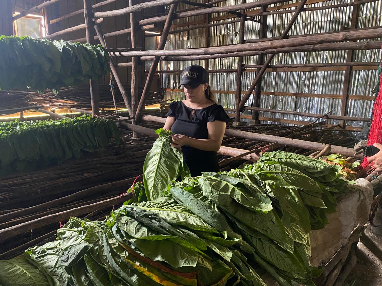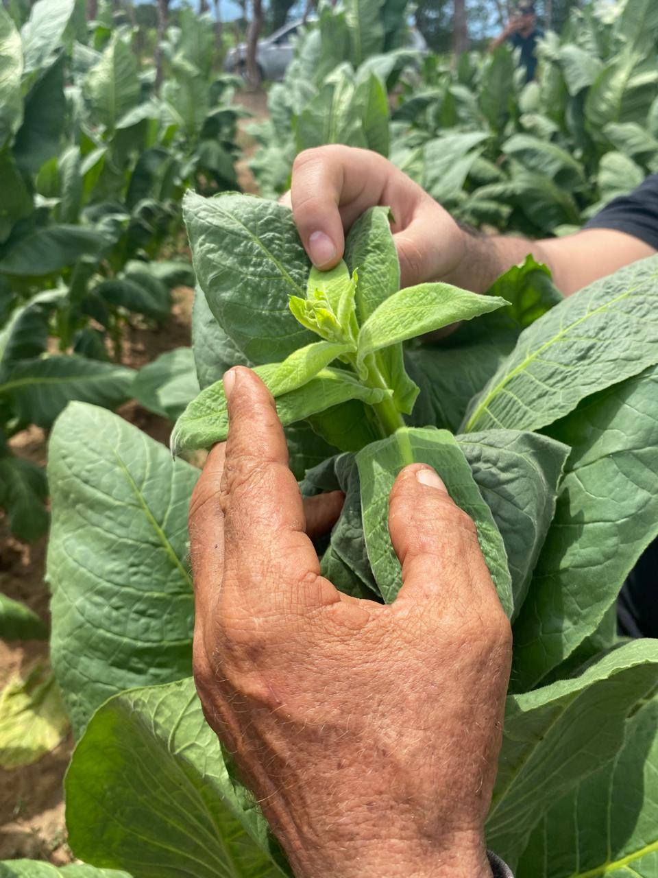 Ahora bien, hay cuadrillas que siembran las plántulas que salen del invernadero; otras, desbotonan las plantas, que alcanzan un metro o metro y medio de altura, y otras más revisan que luego de este proceso no tengan “brotes” nuevos o hijos, que deben retirar. ¿Para qué desbotonar? Nuestro veguero explicó que así se da más fuerza a la planta, las hojas serán más grandes, y por lo mismo también se deshija… Por último, cada cierto número de días se realizan cortes, llevados a las galeras para su secado inicial.