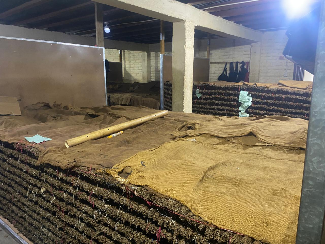 Pasamos entonces a la galera o casa de secado, un galpón de madera de unos 30-40 metros de alto, con ventanas de zinc arriba y abajo, para controlar el aire, temperatura y humedad. En varas de madera, llamadas cujes, se cuelgan 33 pares de hojas por corte, iniciando el secado; un proceso complejo mayoritariamente a cargo de mujeres, quienes con hilos gruesos de colores cosen las hojas para diferenciar los cortes de la planta, a partir de pisos foliares: ligero, centro gordo y viso, entre otros.