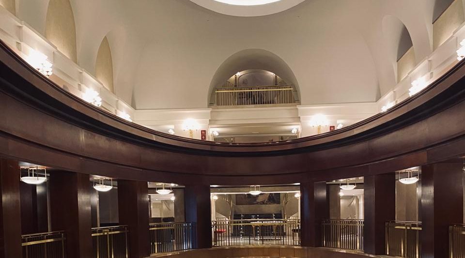 Tomar un camino equivocado me condujo al tercer piso. ¿Quién no se ha perdido en la vida…? Y llegué al Óvalo, la parte más alta, que nos regala una vista completa del interior del recinto. Este espacio, utilizado por los asistentes durante los intermedios, ofrece una perspectiva distinta del vestíbulo y permite apreciar la curaduría de las fotografías de Javier del Real, el fotógrafo oficial del teatro.