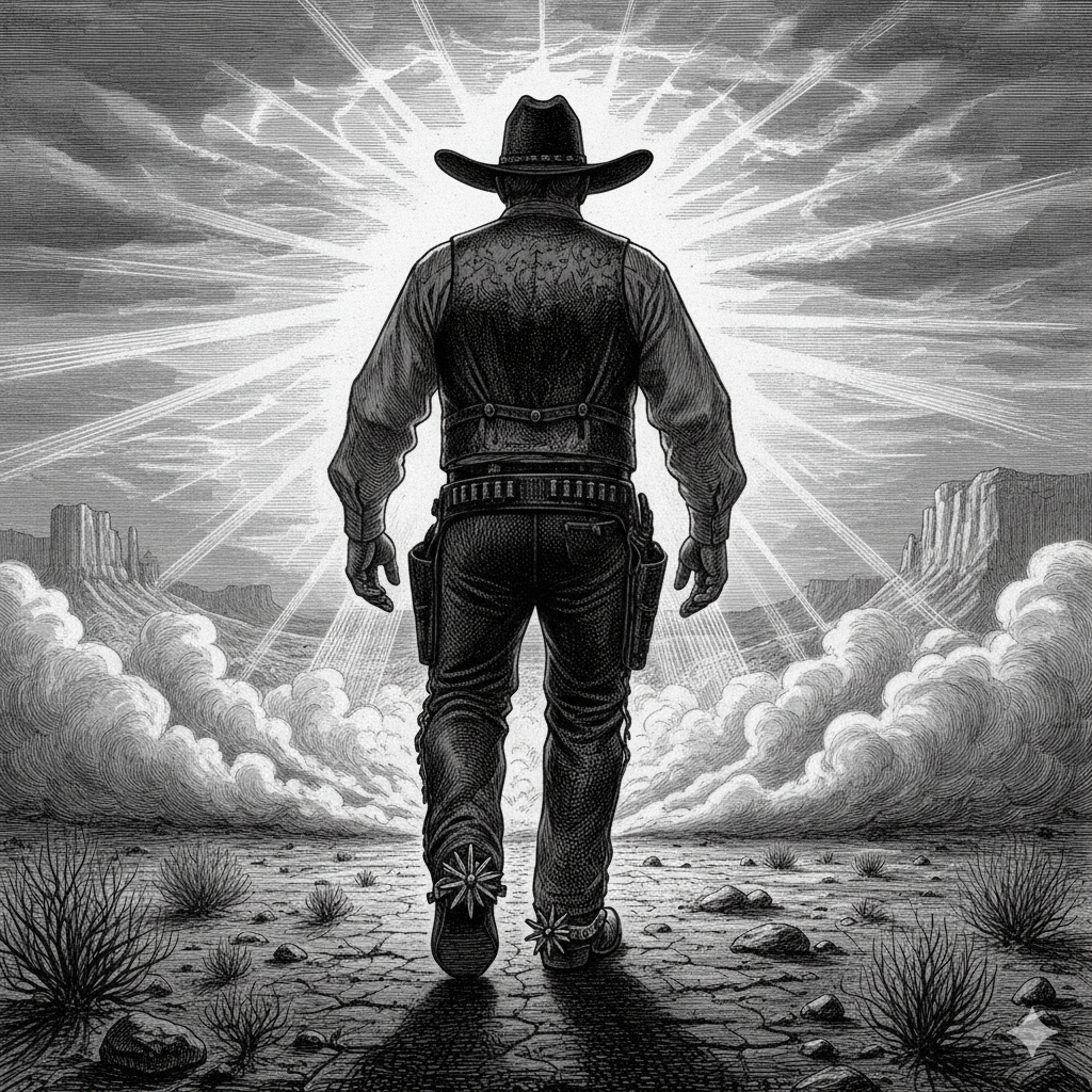 A la distancia, entre todo lo que se alza por el turbio ambiente, una silueta se distingue. Se trata de un hombre grande, corpulento, con un imponente sombrero y espuelas que brillan reflejando el poco sol que llega hasta nosotros.